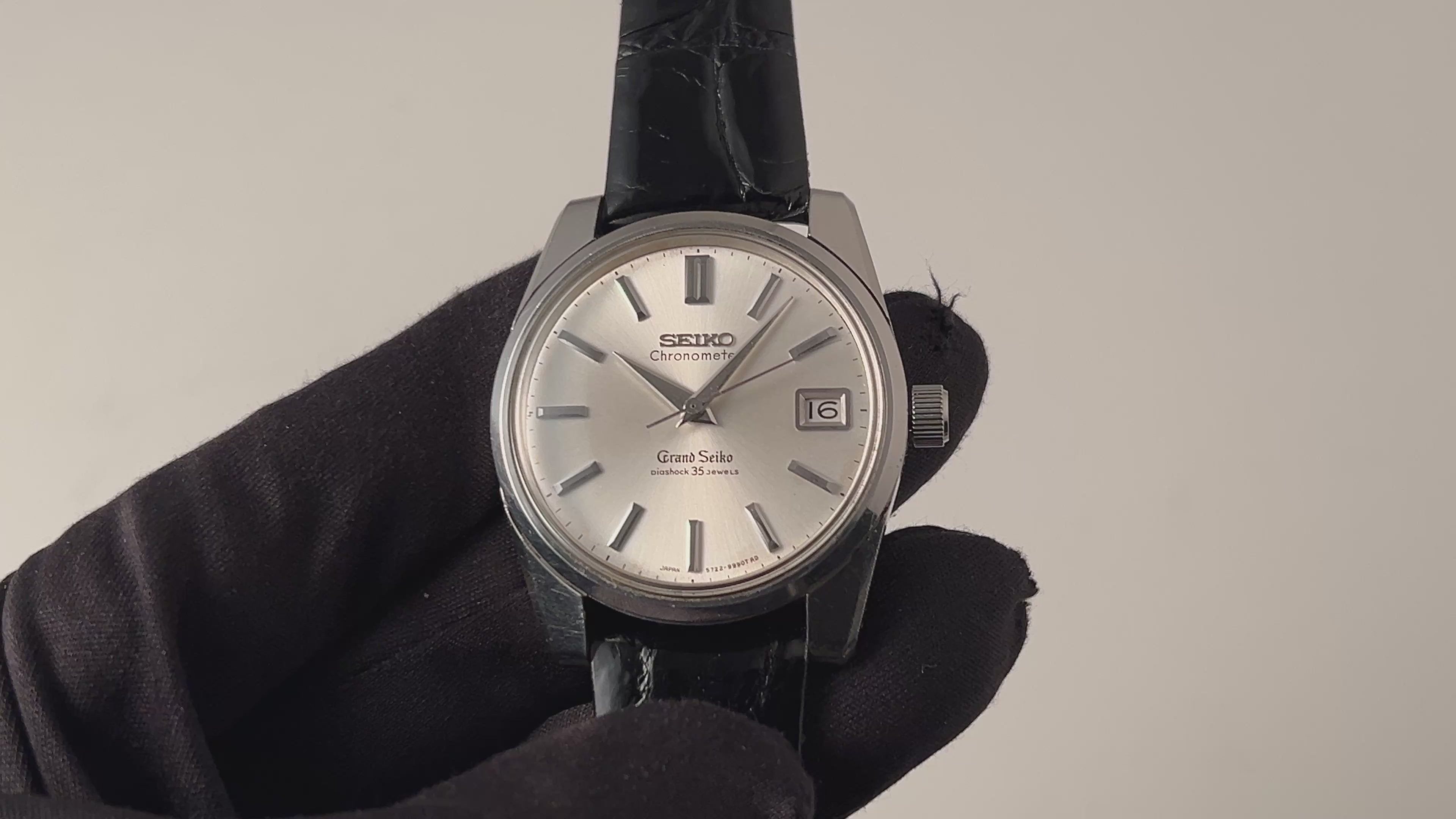 グランドセイコー セルフデーター 2nd前期 1965年製 Ref.5722-9990 57GS クロノメーター 獅子メダリオンです。1stモデルと比較して日付表示付き、スクリューバックケースとなっており実用性に長けた作りになっています。ムーブメントは手巻きCal.5722Aを搭載。文字盤に小さなシミがあります、ケースは小傷はございますが大きなダメージはありません。裏ブタのライオンメダリオンも健在です。手巻きや針回しの操作はスムースです。ベルトは社外のクロコダイル革ベルトを合わせています。