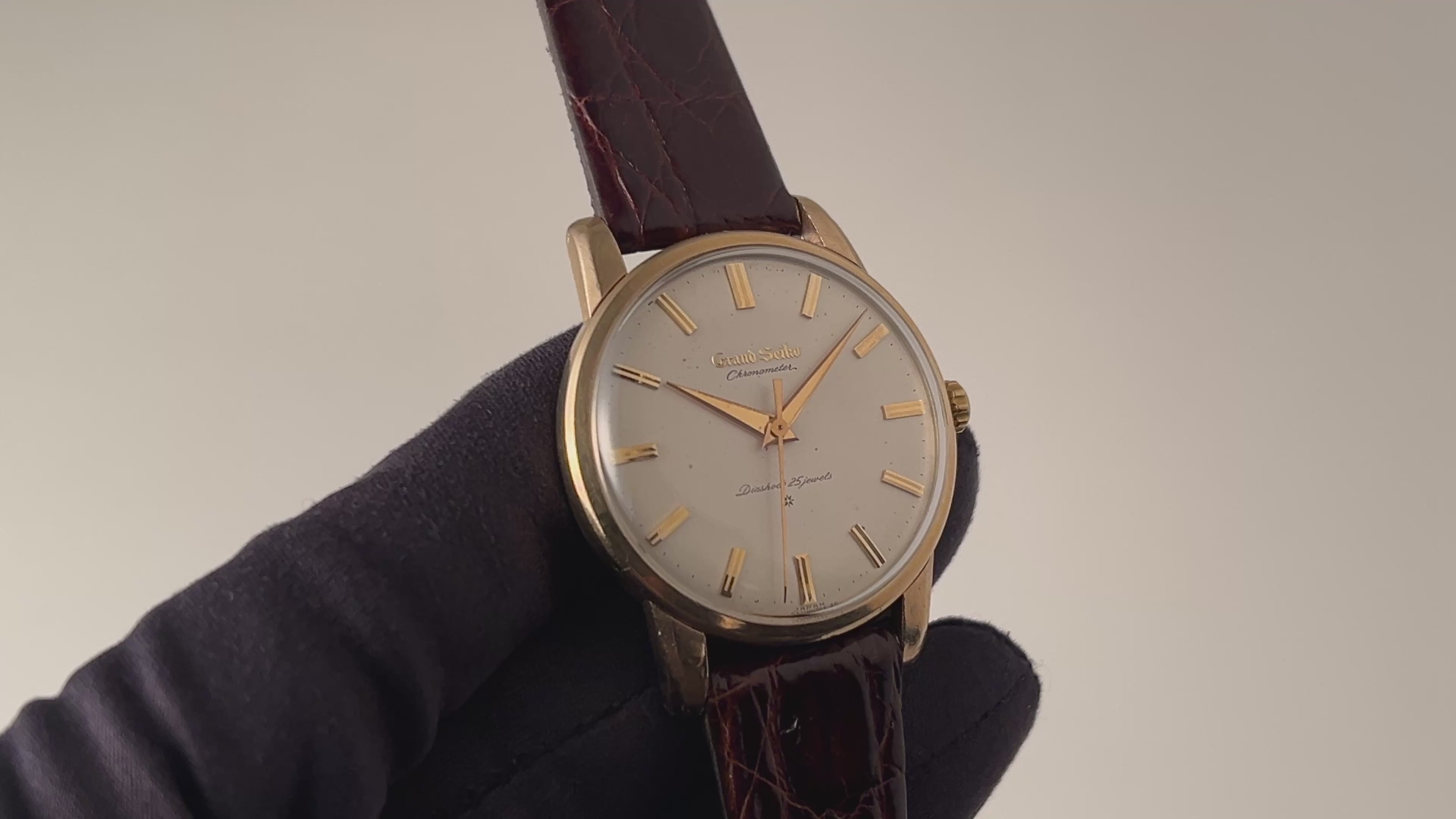 グランドセイコー ファーストモデル 1963年製 Ref.J14070 GS アップライトロゴです。グランドセイコー1stモデルは、1960年から1963年の3年間だけ製造され、こちらの文字盤は、後期型で『GRAND SEIKO』の文字がアップライト仕様のものになります。ダイヤルは多少経年変化が見られますが、概ね良好なコンディションです。14金80ミクロンの金張りケースは、大きなダメージもなく、ライオンメダリオンはしっかり残っています。手巻きや針回しファンクションは問題ありません。ベルトは社外のクロコダイルが取り付けられています。こちらは分解掃除済みになります。