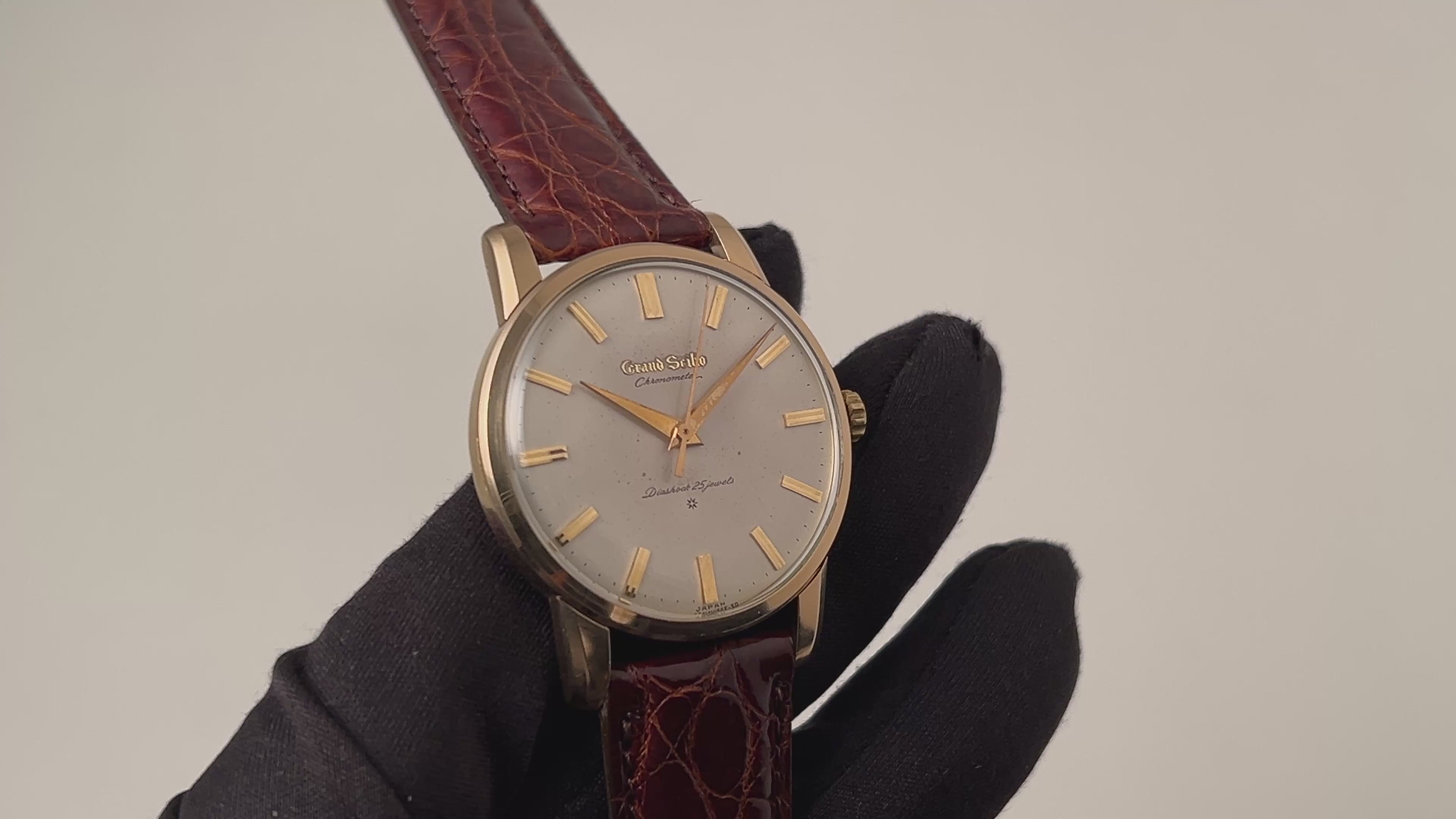 グランドセイコー ファーストモデル 1963年製 Ref.J14070 GS アップライトロゴです。グランドセイコー1stモデルは、1960年から1963年の3年間だけ製造され、こちらの文字盤は、後期型で『GRAND SEIKO』の文字がアップライト仕様のものになります。ダイヤルは多少経年変化が見られますが、概ね良好なコンディションです。14金80ミクロンの金張りケースは、大きなダメージもなく、ライオンメダリオンはしっかり残っています。手巻きや針回しファンクションは問題ありません。ベルトは社外クロコダイルが取り付けられています。こちらの時計は分解掃除済みです。