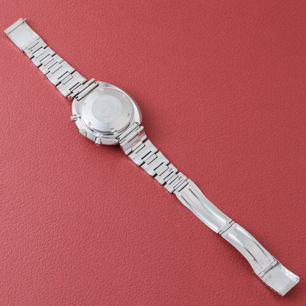 1971年製のセイコー5スポーツスピードタイマー UFO Ref.6138-0011です。円盤型のケース形状から「UFO」の愛称で親しまれ人気のモデルです。縦目の2レジスタークロノグラフでインダイヤルのオレンジマーカーが良いアクセントになっています。機械は自動巻きのクロノグラフムーブメント6138Aを搭載、曜日は日英表記のデイデイトで、早送り機能付きです。ケースに小傷が見られますが大きなダメージはありません。ブレスは純正のステンレスブレスが取り付けてあります。手巻きや針回しの操作はスムースです。
