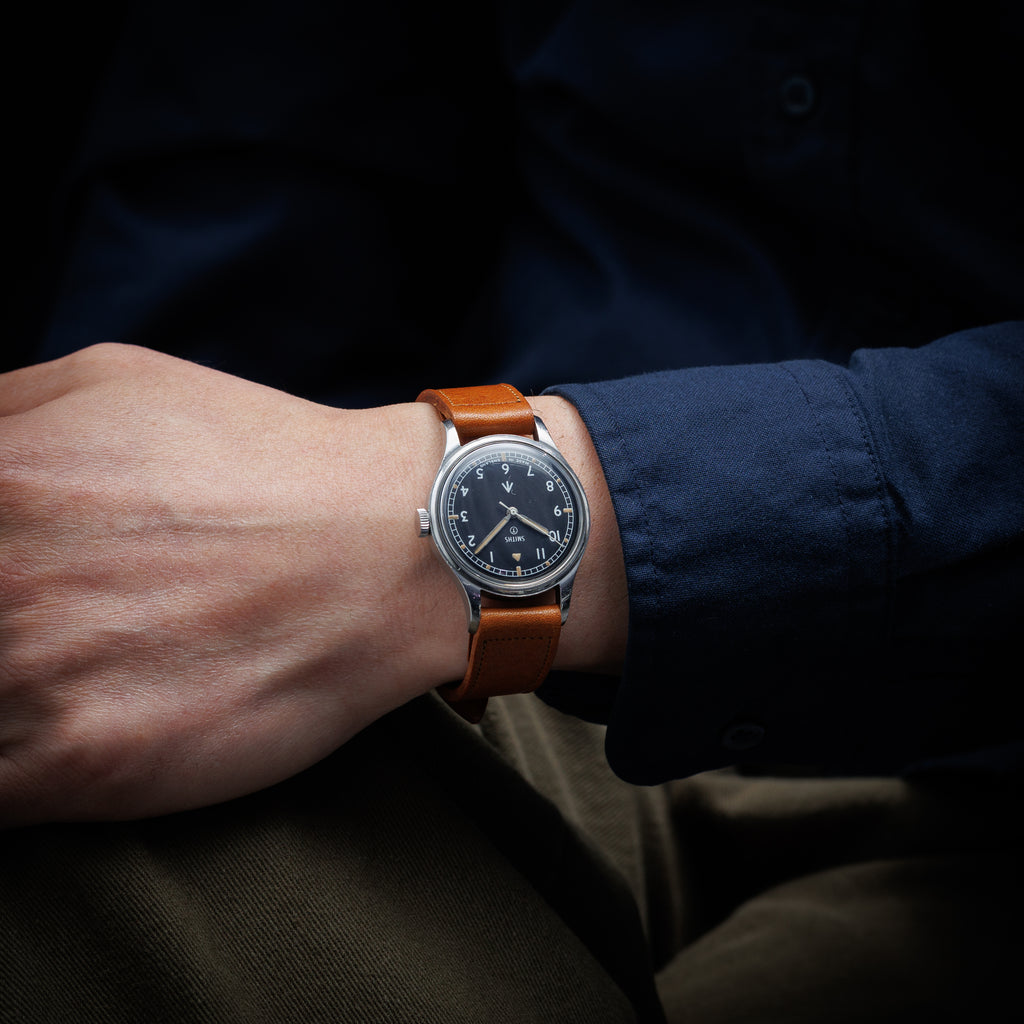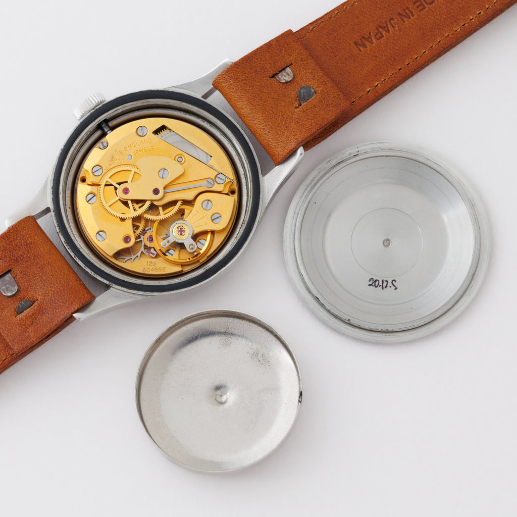 スミス ブロードアロー イギリス軍用時計 1968年製 イングランド製です。スミスは数少ないイギリスの時計メーカーによる自国産軍用時計になります。文字盤にはイギリスの政府所有品を示すブロードアローと夜光塗料にトリチウムが使用されていることを示すTマークが見られます。ハック(秒針規制装置)機能付きで金メッキが施されたムーブメントは軍用品とは思えない仕上がりです。夜光塗料の変色やケースに打ち傷などが見られますが大きなダメージ無く良い状態です。手巻きや針回しの操作はスムースです。ベルトはヴィンテージと相性の良いアキュレイトフォルムが取り付けられています。