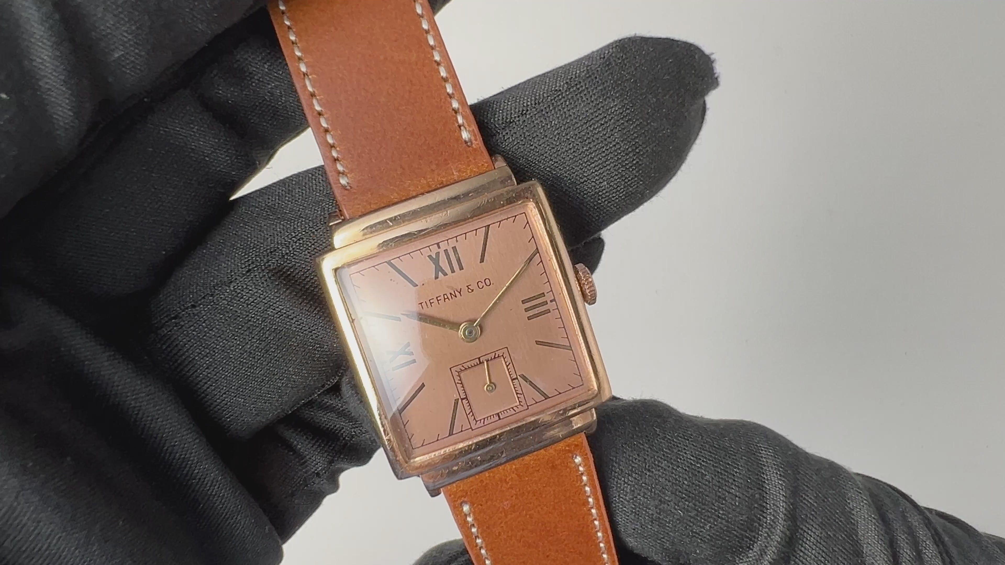 ティファニー モバード製 14金無垢ピンクゴールドスクエアケース 1940年代製 手巻きです。40年代ティファニーの腕時計の多くはモバードが製造していました。雰囲気が良いピンクゴールドケースにピンクダイヤルの組み合わせでサイズ感も良く(幅約24mmリューズ別)ユニセックスで使えます。文字盤は表面の劣化が見られますがシミ等無く綺麗です。ケースは小傷が見られますが大きなダメージはありません。裏蓋にエングレーヴィングが入っています。手巻きや針回しの操作はスムースです。ベルトはファイアーキッズオリジナル、イタリアンレザーのブッテーロ(裏面ラバー)が取り付けられています。