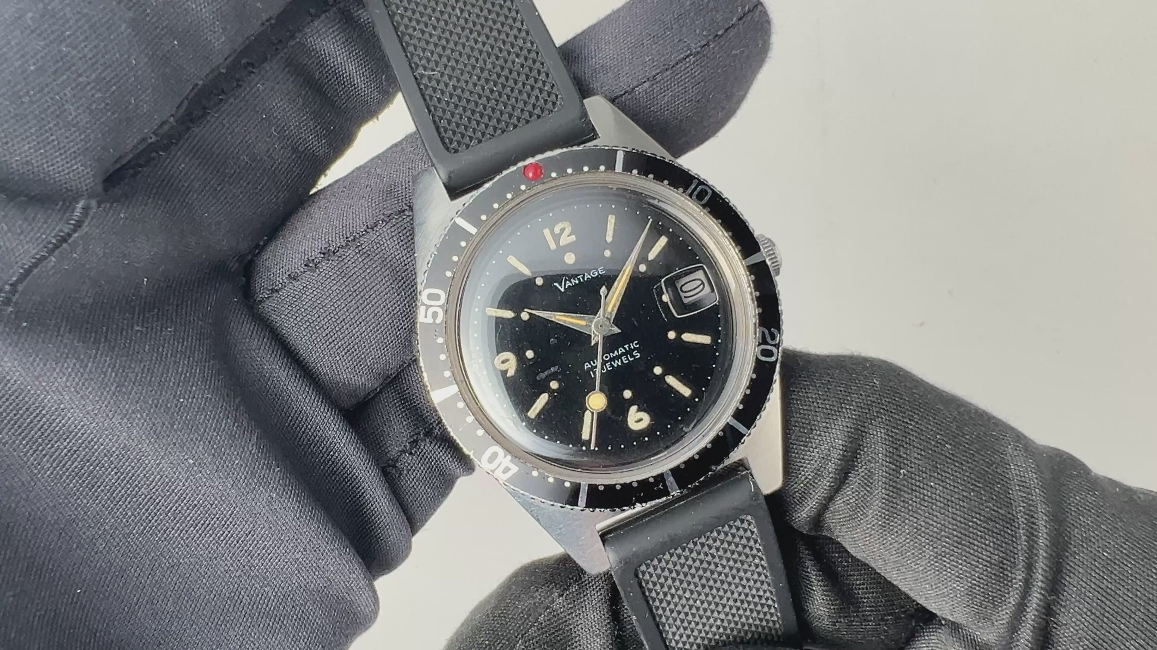 VANTAGE スキンダイバー セイコームーブ 1970年代製 回転ベゼル の入荷になります。600フィート防水の本格ダイバーズウオッチでセイコームーブを搭載しています。文字盤は綺麗とは言えませんが艶感がありトリチウム夜光が程よく変色して良い雰囲気になっています。セイコーのファーストダイバーを思わせるケースデザインで組立は香港になります。ケースは小傷が見られますが大きなダメージはありません。セイコーのマジックレバーを採用した自動巻きで手巻き機能はありません。リューズは交換されています。ベルトは社外のラバーベルトが取り付けられています。こちらの時計は分解掃除済みです。