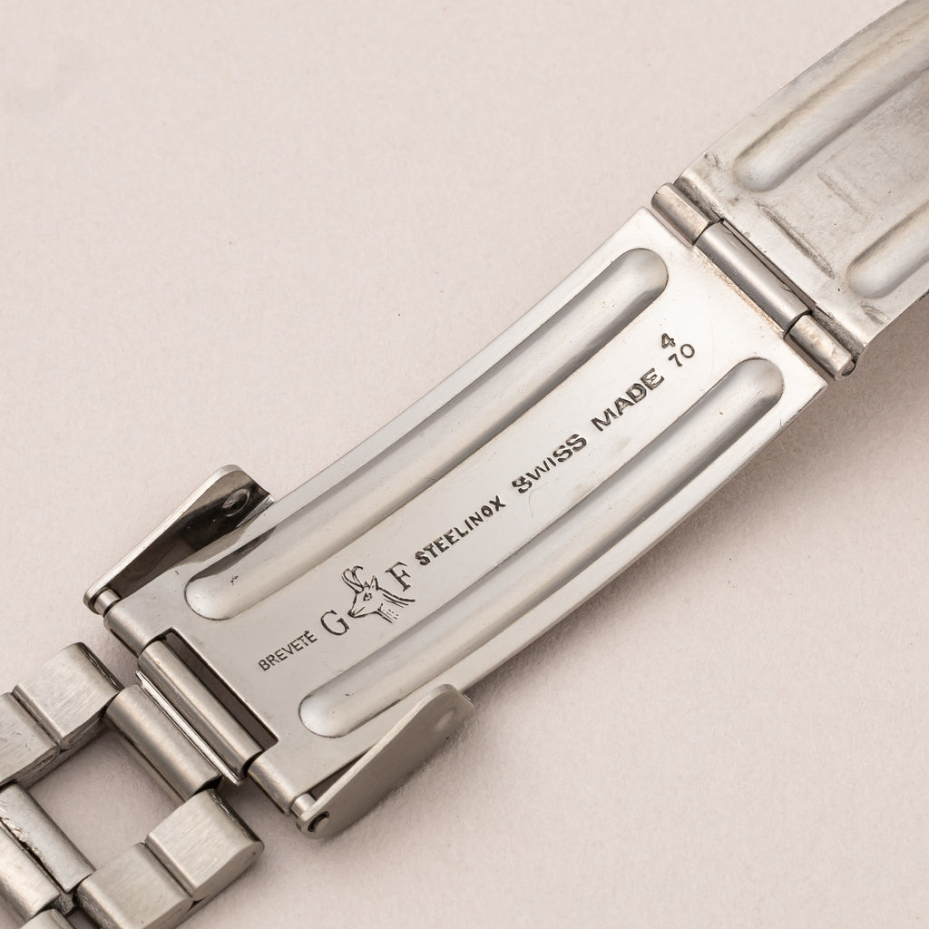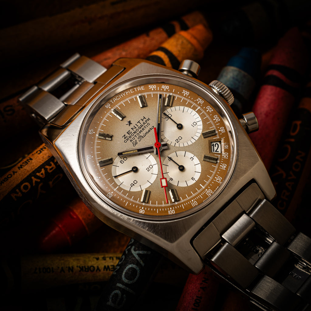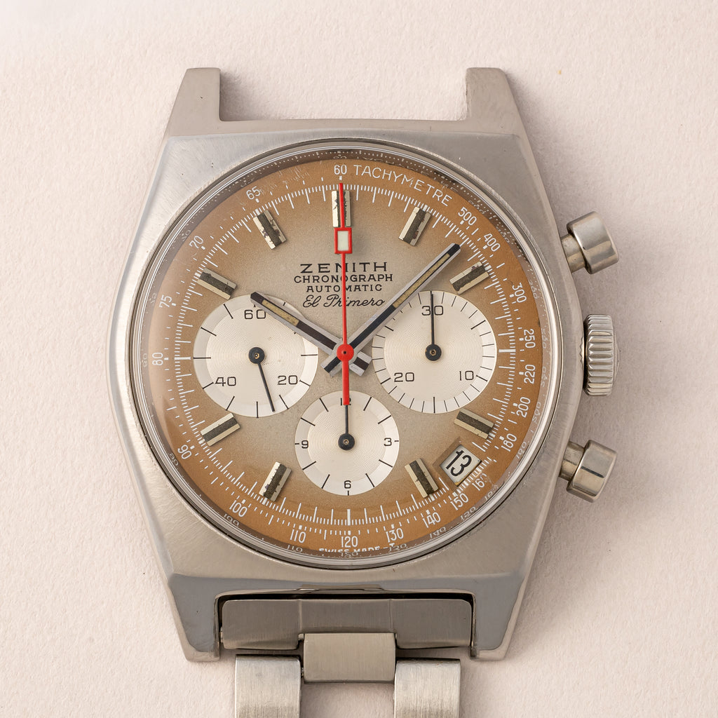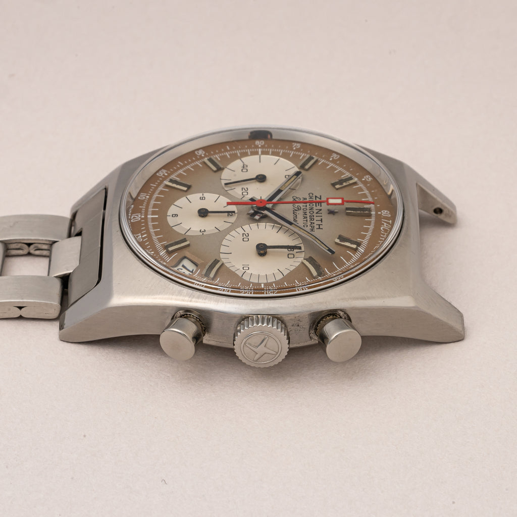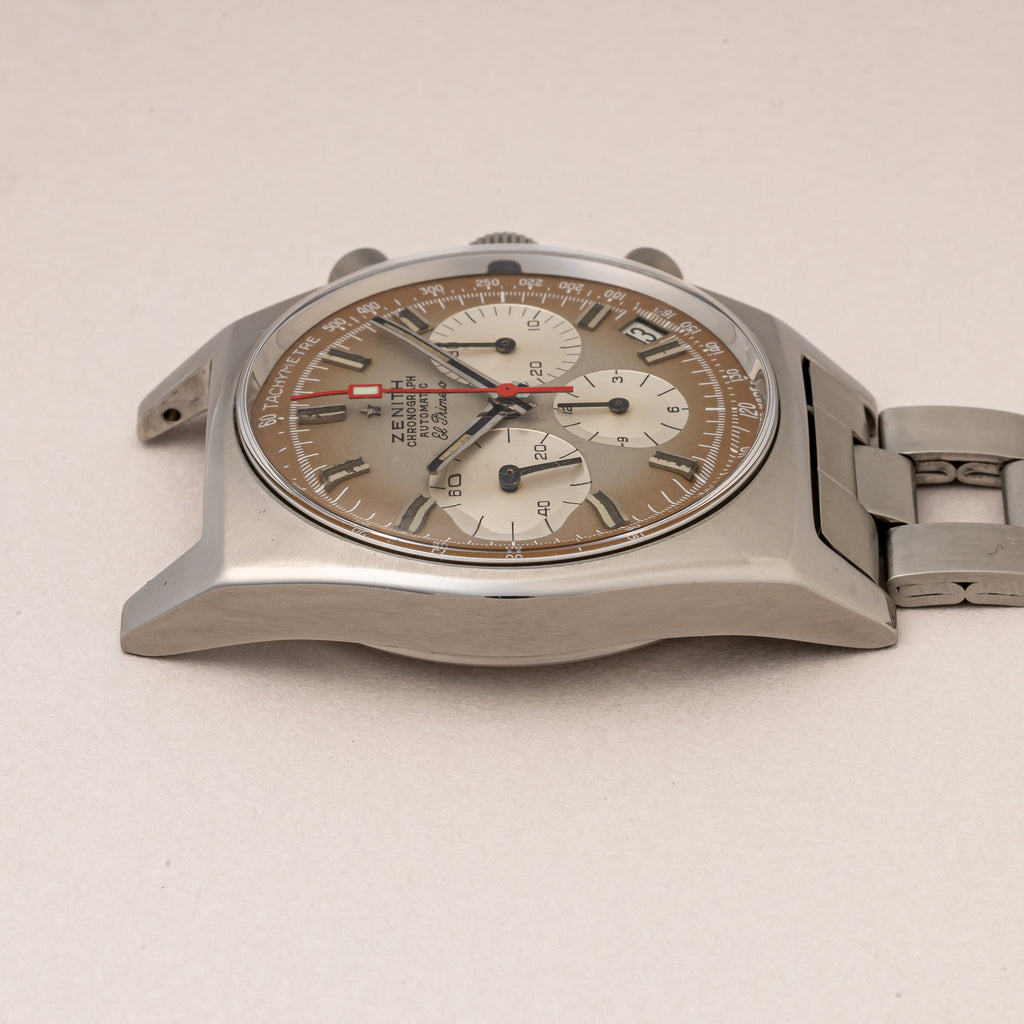 1970年製のゼニス エルプリメロ Ref.A385がケース、アーカイブ、修理納品書付きで入荷しました。世界初の自動巻きクロノグラフとして知られるエルプリメロ。自動巻きハイビート(10振動)クロノグラフを搭載し、当時の最先端技術をつぎ込み、高精度化と厚みを抑えることに成功しています。「スモークダイヤル」と呼ばれるブラングラデーションのダイヤルは肉眼で気になるダメージ無く良好なコンディションです。ケースも多少磨きはありますが大きなダメージはありません。ブレスはラダーブレスと呼ばれる、ゲイフレア社製の純正ブレスが付いています。手巻きや針回し、クロノグラフ操作はスムーズです。こちらは分解掃除済みです。